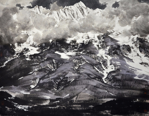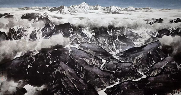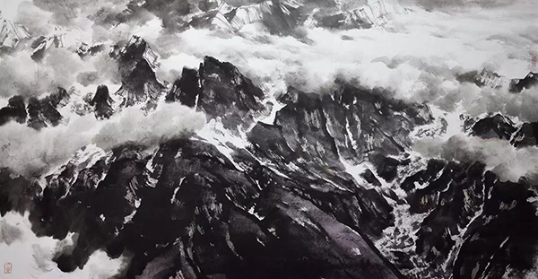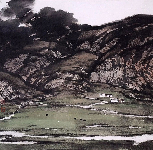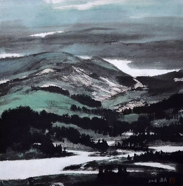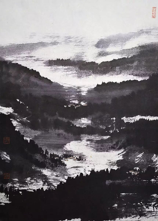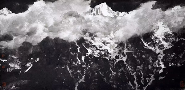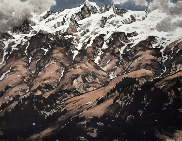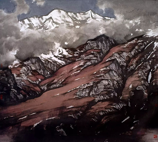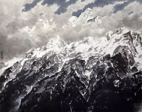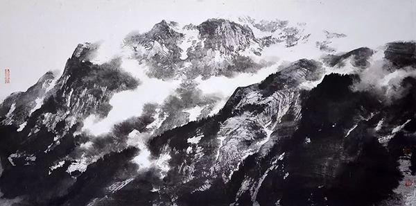 《高原的春天》、《神山圣水》、《高天厚土》、《萬水之源》、《阿里的秋天》、《西疆雪域》、《屹立》、《云橫雪嶺》等作品,厚重而充滿激情。應邀為中南海創(chuàng)作的《天開勝境》山峰連綿壯麗,云霧悠然環(huán)繞,筆法簡單卻生機盎然,筆墨松弛但布局壯觀。遠古的青綠帶著現代的急速感成為畫作的主色調,整個畫面洋溢著新時代太平盛世的和諧景象。