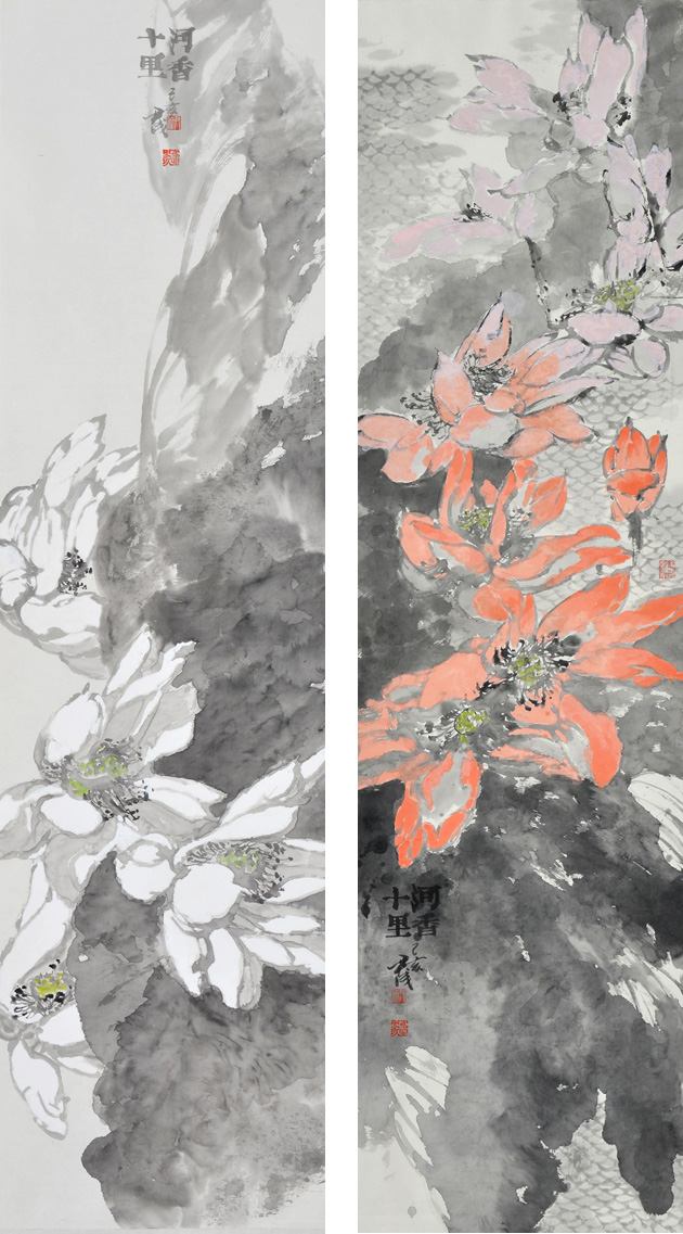 因而,我用“走心”二字來品評尹成的寫意花鳥畫。唯畫家“走心”了,凝神了,滌濾了,他那些六尺畫幅的梅花系列、荷花系列、紫藤系列……才洋溢著自然的野趣和人文的雅趣。