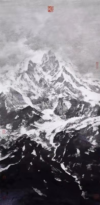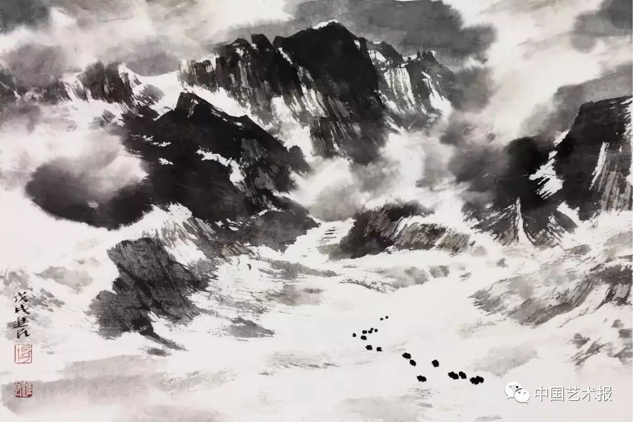 觀楊進(jìn)民《阿里的秋天》《喜馬拉雅》《岷山千里雪》等作,富于寫意氣質(zhì),自然的壯美之“勢(shì)”充盈紙上。實(shí)際上,作品里流露的生命精神往往最直觀、最本質(zhì)。畫中西藏山水的宏大氣象,正是楊進(jìn)民藝術(shù)獨(dú)創(chuàng)性和廣闊心境的有力印證。