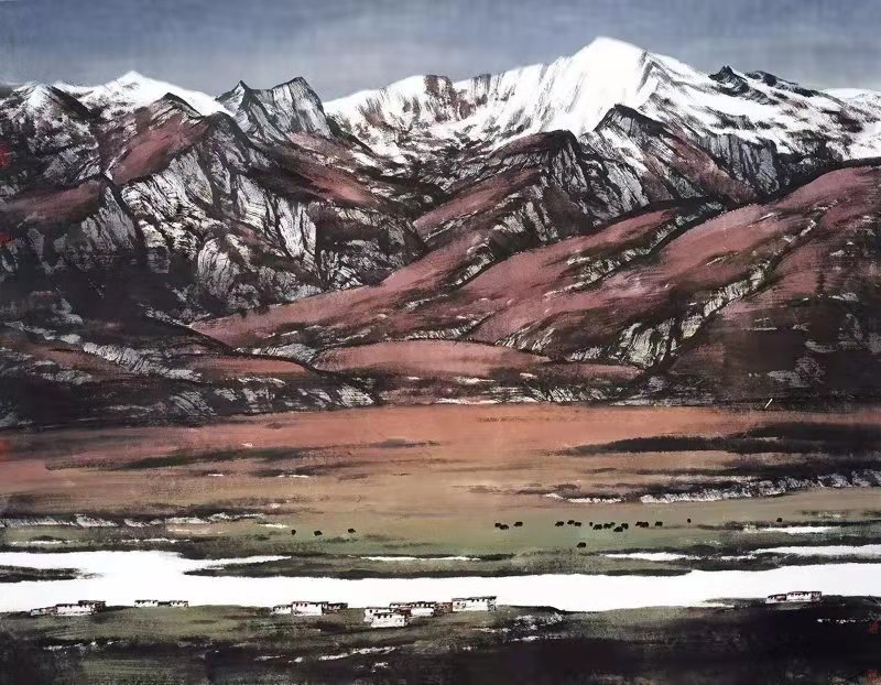 如何畫出西藏大氣磅礴的自然之景,并融入畫者的獨(dú)特感受?楊進(jìn)民坦言,“這是一個(gè)全新的課題”。西藏景色多為大面積的塊面結(jié)構(gòu),色彩絢麗飽滿,明暗對(duì)比強(qiáng)烈,如果采用以線造型、水墨渲染的傳統(tǒng)方法,則會(huì)“水土不服”。經(jīng)過不斷嘗試和摸索,楊進(jìn)民終于找到了新的路徑。他說:“我試著把毛筆和板刷并用,結(jié)合中國畫的線條和西方繪畫的塊面,融合前者的主觀寫意性和后者的客觀寫實(shí)性,還吸收了其他藝術(shù)形式的有益成分,力求創(chuàng)造一種既非完全中國的、又非完全西方的,既區(qū)別于傳統(tǒng)、又區(qū)別于他人的獨(dú)特形式。”