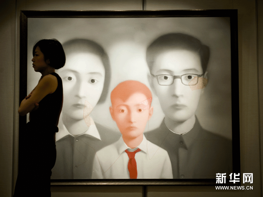 (3)11月14日,一名工作人員從畫家張曉剛的油畫作品《大家庭》系列前走過。