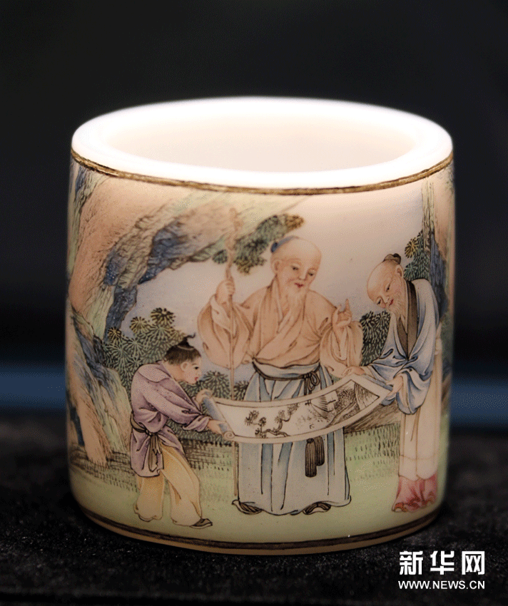 (2)在佳士得秋季拍賣預展上展出的清乾隆料胎畫琺瑯四老圖小筆筒在28日舉行的拍賣會上以4882萬港幣成交(11月25日攝)。