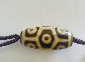 天珠是藏民的一種傳統(tǒng)飾物,用含有玉質(zhì)和瑪瑙成分的九眼頁巖打磨而成。因石上有天然形成的眼狀圖案,經(jīng)打磨后呈現(xiàn)出神秘、莊嚴的宗教色彩,形似天眼,故名天珠。關于其來源,有很多神秘的傳說。一種比較可信的說法是遠古時期,有隕石墜落喜馬拉雅山脈,對這一地區(qū)的礦石產(chǎn)生了影響,故天珠具有強烈的磁場能量,為別處的同類礦石所無。藏民將這種磁場能量視為上天賜予的感應,加上九眼頁巖稀少,硬度又高,達摩氏8度以上,由此也點燃了來自世俗的想象,被渲染蘊含有神秘的加持力量。