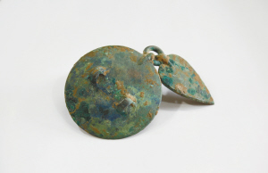 藏友帶來兩面形制特殊的“銅鏡”。這兩面“銅鏡”鏡面中心皆微內(nèi)凹,其中一面直徑約9厘米,鏡背飾雙鈕,邊緣處以圓環(huán)與一鏟型裝飾相連。鏟型裝飾物的邊刃鋒利,似有實(shí)用功能;另一面直徑約8.5厘米,背面飾重環(huán)紋,橋形鈕。