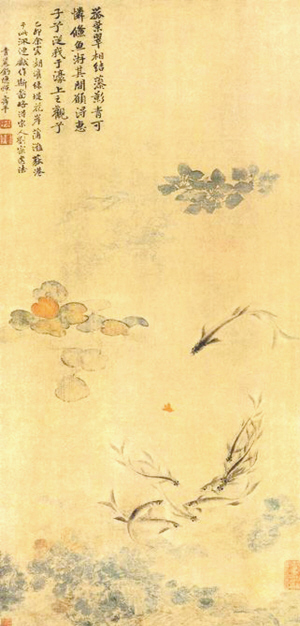 康熙十九年起,惲壽平客居太倉王時敏家中達3年之久,觀摩了王時敏所藏的歷代書法和名畫,從傳統(tǒng)中汲取了更多的營養(yǎng),又經(jīng)常與婁東文人雅士談詩論畫,使他的詩書畫諸藝更趨精進純熟。居住太倉期間,惲壽平創(chuàng)作了大量作品,構(gòu)思、筆墨和意境都得到了突破,畫技達到了爐火純青的境界,《落花游魚圖》便是這一時期的精心之作。