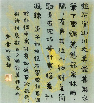 這首詩寫于20世紀(jì)50年代那個“全民寫詩”的特殊年代。內(nèi)容并不重要,關(guān)鍵是這種形式的傳承,詩本身又是那么有時代特色。大約也是在那個時期,老舍收得清末畫家姜筠一幅圓形小幅山水畫,以及清末書法家吳春鴻寫給頌庭的一幅小字。兩幅作品都裝裱成冊頁式的畫片,留有很大的裱邊。老舍“故伎重演”,分別用毛筆在裱邊上題詞,評說這兩幅作品,極俏皮,顯示了典型的老舍式幽默。