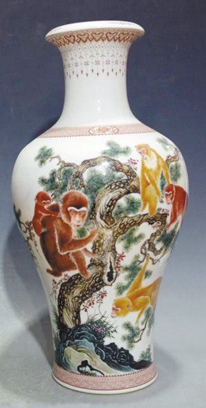 “松柏月中老,猿猴物外啼。”猴年來臨之際,品讀蘇東坡《半山亭》中的詩句,欣賞新淘得的一件粉彩猴圖賞瓶,頓生美不勝收之感。