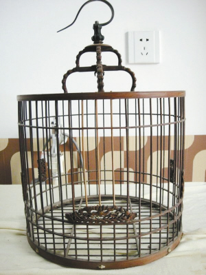鳥籠。在老北京的胡同里,或者城市的公園里,經(jīng)常能看見一群遛鳥的老大爺。別小看這些老大爺,他們雖年華已逝,但爭(zhēng)強(qiáng)好勝的心卻不輸年輕人。他們不僅要比誰(shuí)的鳥兒更漂亮,歌聲更動(dòng)聽,還要看誰(shuí)的鳥籠更名貴。隱居鬧市靠著一間小賣部過(guò)日子的六爺便是此道中人,養(yǎng)鳥成為他的人生樂(lè)趣之一,鳥籠也便成了六爺閑逸生活里的一件必需品。筆者收藏一只清代鳥籠,為黃楊木所制,直徑45.6厘米,高66.8厘米。在老北京街頭的眾多鳥籠中,這樣的籠子只能算小號(hào)。但,形制小并不影響其制作的精良——鳥籠上面雕刻有花瓣紋和樹葉紋,點(diǎn)綴之上,驚鴻一瞥;籠子頂上有寶葫蘆狀的支撐和半月形掛鉤,為黃銅所制。這般精巧的做工,即便是放在今天的胡同、公園,也會(huì)惹得眾人艷慕,更不用說(shuō)是已經(jīng)有一百多年歷史的清代之物了。