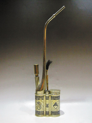 煙袋。老炮兒六爺是煙不離手。不過(guò),六爺常抽紙煙,而六爺?shù)男值軣粽謨撼榈膮s是煙袋鍋?zhàn)印9P者便收藏一桿這樣的清代煙袋鍋?zhàn)。其?1.5厘米,底部寬5.8厘米,為白銅所制,使用的是烤藍(lán)工藝。由于年代久遠(yuǎn),手握部位和煙袋嘴兒已經(jīng)失去往日的光澤。底部是裝煙絲的部位,上面兩邊雕刻福字紋,中間雕刻雜寶紋,以及祥云圖案。煙袋底部還有“丁未年,鎮(zhèn)海王恒業(yè)自選”的楷體小字,丁未年,大約是1847年,為鎮(zhèn)海一個(gè)叫王恒業(yè)的人所使用,距今已有近170年的歷史了,歷經(jīng)戰(zhàn)亂,能保存至今,十分不易。