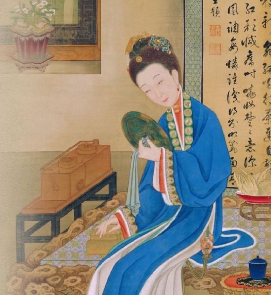 裘裝對(duì)鏡。仕女身著裘裝,腰系玉佩,一手搭于暖爐御寒,一手持銅鏡,神情專注地對(duì)鏡自賞,“但惜流光暗燭房”的無奈之情溢于眉間。畫中背景是一幅墨跡酣暢的行草體七言詩掛軸,落款為“破塵居士題”。破塵居士是雍正皇帝為雍親王時(shí)自取的雅號(hào),表示自已清心寡欲、不問榮辱功名的志趣。