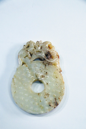 這只玉猴,雙目圓睜,一手捂耳,一手垂于膝下,正是一副抓耳撓腮的靈猴模樣。據(jù)專家介紹,制作這只玉猴的材質(zhì)并不名貴,不是“血統(tǒng)”高貴的新疆和田玉,而是地方玉。但從遍布玉表的橘皮及深入玉肌的沁色來看,這只玉猴是很有些年代的老東西。