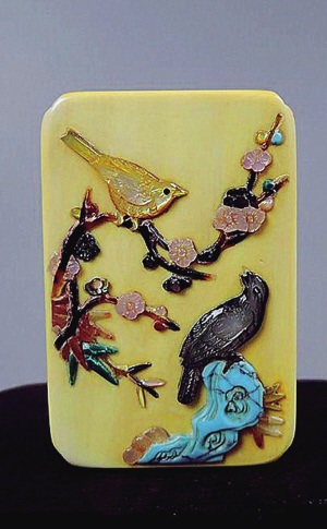 筆者收藏有一塊牙雕牌,長(zhǎng)6.3厘米,寬4.2厘米,厚1.5厘米,為民國(guó)及解放后的篆刻名家方介堪的作品。上面的藝術(shù)便是多層面的,在牙牌的正面是一幅“喜鵲登梅圖”,展現(xiàn)的正是喜氣洋洋的新春氣氛。只見(jiàn)一枝梅花從墻角伸展而出,或墨黑,或淡雅,有一只淺黃色的喜鵲,站在梅枝上快樂(lè)地鳴叫,旁邊一塊藍(lán)色的怪石上,也有一只黑色的喜鵲在嘰嘰喳喳地叫著,兩只喜鵲正訴說(shuō)著它們的新春快樂(lè)。和梅花一同傾斜伸展的,有一根竹子,蒼翠、濃綠、生機(jī)盎然。