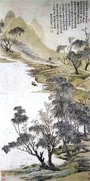 《湖天春色圖》是吳歷典型風(fēng)格的代表作,表現(xiàn)的是湖畔堤邊初春的風(fēng)光。畫面近處,幾株古拙的柳樹,柳芽黃綠;枝頭有鳥雀飛舞爭鳴;樹下是叢叢青草,片片綠蔭。中間寬闊的湖面上,有水禽追逐游嬉。再往上看,一條小徑逶迤起伏,蜿蜒盤桓,順著湖岸上參差錯落的綠柳,向畫面深處延伸,漸漸遠去。左上角的遠山采用由濃到淡的漸變綠色處理,使畫面顯得空靈開闊。此情此景,與北宋歐陽修《踏莎行·候館梅殘》的“離愁漸遠漸無窮,迢迢不斷如春水”、“平蕪盡處是春山,行人更在春山外”所表現(xiàn)的意境,是何等的切合!畫面上春風(fēng)拂柳,綠草如茵,禽鳥鳴于湖面、柳枝之間,遠處青山一抹,顯得自然清新,意境悠遠,令人心曠神怡,可謂不可多得的傳世名畫!