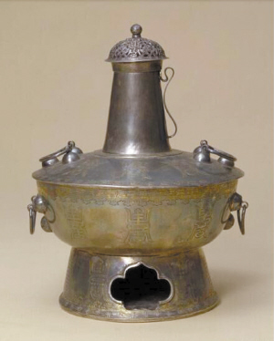 由于火鍋的涮食方式很符合滿人的食性,清代的達官貴胄冬日宴客,多是吃火鍋。故銅火鍋在清代盛行一時,各種造型設計層出不窮。清末隨著國門被打開,又有了以煤油、酒精為燃料的火鍋,使用便捷的同時,造型與雕飾也更為精美講究。不同審美情趣的匠人,融合南北技藝,以豐富的想象力和創(chuàng)造力,在銅火鍋上展現(xiàn)出多姿多彩的風貌,使之成為中上人家的必備炊具。