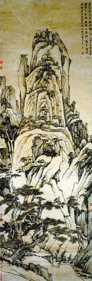 《黃山天都峰圖》是漸江山水畫(huà)的代表作,作于他50歲時(shí)。此畫(huà)章法新穎,氣勢(shì)磅礴,巍巍天都峰嵯峨其上,直指霄漢,那劍拔挺立之勢(shì)孤高絕俗,令觀者嘆為觀止。雄峻的山勢(shì)、奇古的松姿,概括表現(xiàn)了黃山古松、奇石的特征,可以說(shuō)是盡得黃山的神韻和天趣。整個(gè)畫(huà)面樸素簡(jiǎn)潔,幾乎沒(méi)有皴擦和過(guò)多的點(diǎn)染,具有瘦削、純靜、幽深和峻遠(yuǎn)之美,又能于瘦削處見(jiàn)腴潤(rùn)、純靜處見(jiàn)剛正、簡(jiǎn)潔處見(jiàn)偉厚。層巒聳秀,淡遠(yuǎn)蕭疏,雖淡無(wú)可淡而饒有余韻。畫(huà)中右上角有作者自題七絕一首,贊譽(yù)黃山的靈秀和壯美,其中兩句是:“披圖瞥爾松風(fēng)激,猶似天都歌翠微。”
