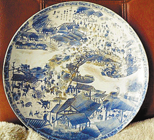 青花“上河”風(fēng)情素雅。青花是我國(guó)瓷器藝術(shù)的精華,以其素雅恬淡、意境遼闊而受到青睞。清代的青花,多為仿制明永樂(lè)宣德年間的蘇麻離青,工藝精細(xì),修胎講究,質(zhì)量上乘。我收藏一只清朝乾隆年間制作的青花大盤(pán),直徑35.3厘米,它屬于一種裝飾用的盤(pán)子,實(shí)用性不強(qiáng),叫“大盤(pán)”。在大盤(pán)上,橋梁房屋,流水行人,熙熙攘攘、熱熱鬧鬧,逼真的龍船,擎著的油紙傘,擔(dān)子車(chē)馬,無(wú)論坐著的,站著的,還是行走著的,都透露出安閑自得的模樣,那是宋人獨(dú)有的氣韻。盤(pán)子的左上角有“清明上河圖”“北宋宮廷畫(huà)家翰林大學(xué)士張擇端”的字樣,模仿歸模仿,還是要注明“版權(quán)”的。在盤(pán)子的底部,有“乾隆年制”的印章,當(dāng)為乾隆年間的作品。