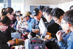 郵迷們熱情認(rèn)購(gòu)新郵。  本報(bào)記者 仲冬竹 攝