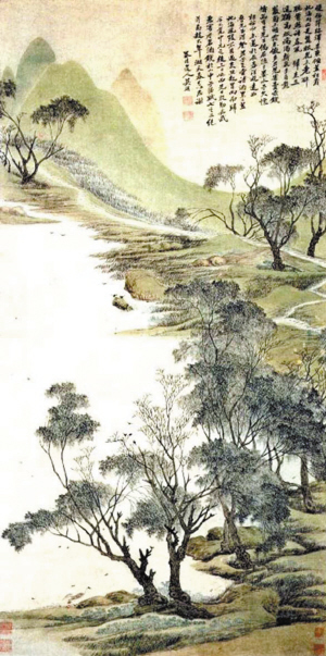 《湖天春色圖》是一件十分抒情的作品,皴染工致細(xì)麗,敷色淡雅華滋,真實(shí)地描繪了江南水鄉(xiāng)的綺麗春色。畫家站在小山崗上,俯視湖岸的一角,但見彎彎坡岸上的柳樹婀娜多姿,樹下布滿綠茵,水塘中蘆葦叢生,有鵝在游動(dòng)覓食,幾只春燕歡快地掠過水面……朦朧的遠(yuǎn)山起伏,似乎被籠罩在一層薄薄的煙霧之中。畫家傳達(dá)了清新的春天氣息,新綠的草坡、嫩芽,使整個(gè)畫面以綠色調(diào)為主,充滿了悅目的生命力。此圖構(gòu)圖十分別致,不再是傳統(tǒng)的散點(diǎn)透視,著色上也吸收了西洋畫的方法。春山綿邈,蒼翠欲滴,好像是隨手拈來的江南一帶到處可見的水鄉(xiāng)一角,使人感到相當(dāng)親切、自然。