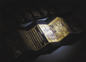 全本《妙法蓮華經(jīng)》為鳩摩羅什譯本,共7卷,泥金紺紙,金絲欄,書寫工整莊嚴(yán)。每?jī)?cè)皆繪有說(shuō)法圖,以金線勾勒,華貴不凡。冊(cè)頁(yè)外首上下兩面亦有泥金印花紋彩繪并書標(biāo)“妙法蓮華經(jīng)”之卷次。此卷由廣東鑒藏名家孔廣陶、陳灃、黃紹憲、何犖等遞藏,后為蔣谷孫所得。