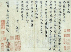 但也有一些鑒賞家認(rèn)為,按宋人書札的格式,信札起首處都有“某啟”或“某某頓首”的抬頭署名,而《局事帖》沒有“鞏啟”或“曾鞏頓首”字樣,他們懷疑抬頭署名被有意裁掉,對(duì)此帖是否為曾鞏真跡保留意見。筆者認(rèn)為,可能因?yàn)槟承┰,曾鞏在抬頭處沒有署名,所以加了押尾印章“曾鞏再拜”,予以彌補(bǔ)。