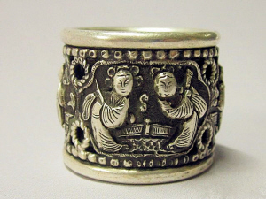 筆者收藏有一枚銀質(zhì)扳指,呈圓筒狀的大鼓造型,其直徑2.9厘米,高2.4厘米。上面雕刻有仕女圖案,共四幅,描繪的是仕女們手拿各種樂(lè)器正在舞蹈的情形,仿佛從中便能聽(tīng)到絲竹陣陣,清唱聲聲,當(dāng)真醉人。