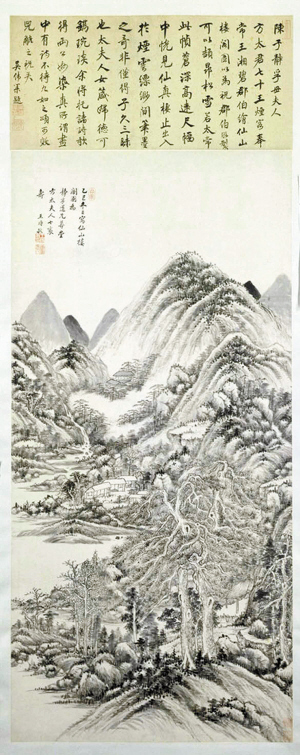 這幅畫上,還有大詩人吳偉業(yè)的珍貴題字:“此幀蒼深高遠,尺幅之中恍見仙真棲止,出入于煙云縹緲間,筆墨之奇非僅得子久三昧也。真所謂畫中有詩,不待九如之頌,可效口觥之祝矣。”
