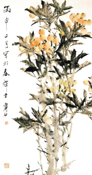 繪制這幅畫時(shí),虛谷已是73歲的高齡,然而畫面如此精氣逼人、筆筆送到,真仿佛如有神助。畫中一叢長(zhǎng)勢(shì)壯盛的枇杷枝干直挺,一派崢嶸之氣。構(gòu)圖頂天立地,布滿全幅,用逆筆和枯筆粗細(xì)有致地畫出了鮮明的節(jié)奏感。下方足足四分之一的畫面以虛而淡的筆法和色調(diào),襯托出上部鮮艷的果實(shí),使觀者的目光情不自禁地上移,也使枇杷樹(shù)在無(wú)形之中有了蓬勃向上的生姿,頓生明媚而祥瑞的意境。