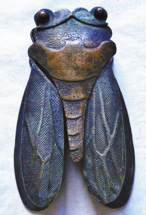 這只墨盒長(zhǎng)6.8厘米,寬3.6厘米,厚1.8厘米,重約100克。墨盒的造型非常別致,整體呈蟬形,碩大的蟬頭,突出的蟬眼,環(huán)節(jié)分明的蟬腹,無(wú)不惟妙惟肖。最為精妙的是兩只蟬翼,看上去纖薄輕巧、栩栩如生,翼下卻另藏玄機(jī)。輕輕旋開(kāi)蟬翼頂部,兩只小巧玲瓏的墨盒就顯露出來(lái)了,分別鑲嵌于蟬腹兩側(cè),里面可以盛放墨汁。把打開(kāi)的蟬翼合上,兩只墨盒隱藏起來(lái),蟬翼、蟬腹又渾然一體。因年代久遠(yuǎn),墨盒上包漿深厚,色澤不再鮮艷,卻另有一番古樸、凝重的滄桑感。