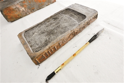 有了更多的溝通和交流,戚朝陽古磚收藏的花樣也越來越多。他自己設計,用紋飾不那么完整的澄泥磚做成了磚硯,發(fā)墨不損毫,居然有了點澄泥硯的味道;他用有殘的文字磚養(yǎng)起了菖蒲,將文房之雅彰顯到了極致……