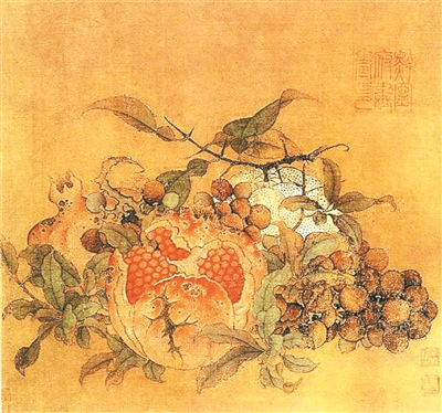 《橘子葡萄石榴圖》是南宋宮廷畫家魯宗貴的作品,絹本,設(shè)色,縱24厘米,橫25.8厘米,現(xiàn)藏美國波士頓藝術(shù)博物館。此畫的基調(diào)是暖色調(diào)的橙色,令人很容易聯(lián)想到秋季、豐收、金黃等詞匯。此圖為折枝花果畫,繪橘子、葡萄和石榴,而以石榴為主要描摹對象。其中擺放在畫布最前面的石榴,已經(jīng)成熟裂開,露出里面層層密布的如紅瑪瑙般的石榴籽,且粒粒飽滿,不禁令人眼饞嘴饞。整幅畫用色精細(xì)、沉著,寫實(shí)性極強(qiáng),作者采用鮮麗的色彩、密集的構(gòu)圖,營造出果實(shí)累累、喜氣洋洋的視覺效果。橘子、葡萄、石榴,這三種水果籽多,故此畫寓意多子多孫的美好愿望;橘子的“橘”,又與吉祥的“吉”音近,因此,此圖又有希望子孫吉祥的寓意。所以,此畫也叫《吉祥多子圖》。