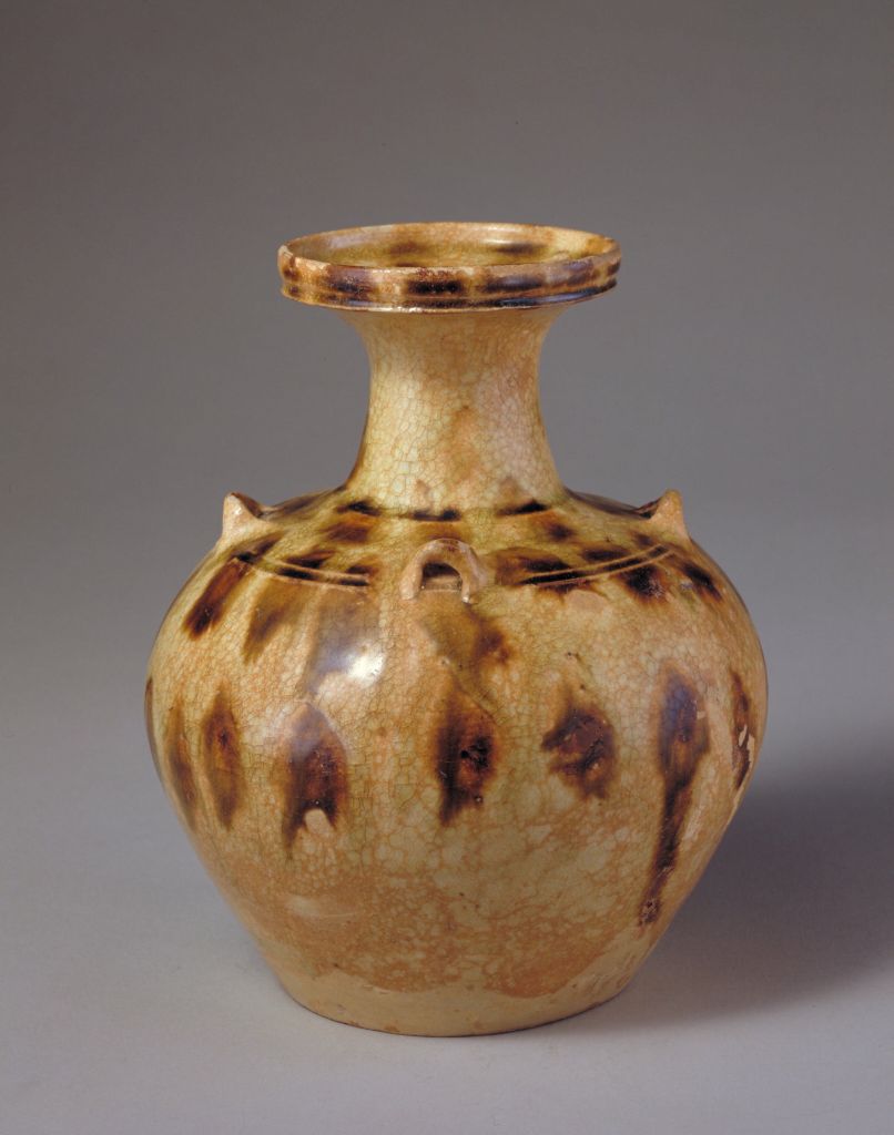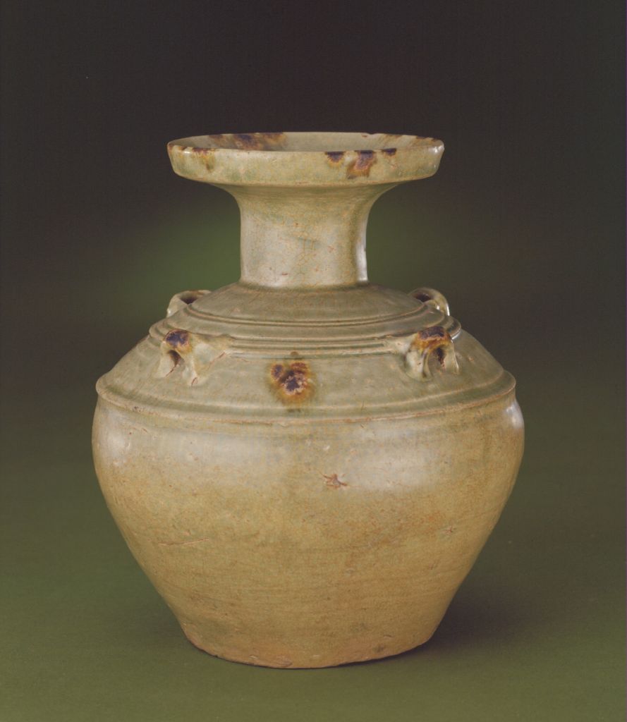 青釉褐斑四系壺,東晉,高17.9cm,口徑8.4cm,底徑8.7cm。