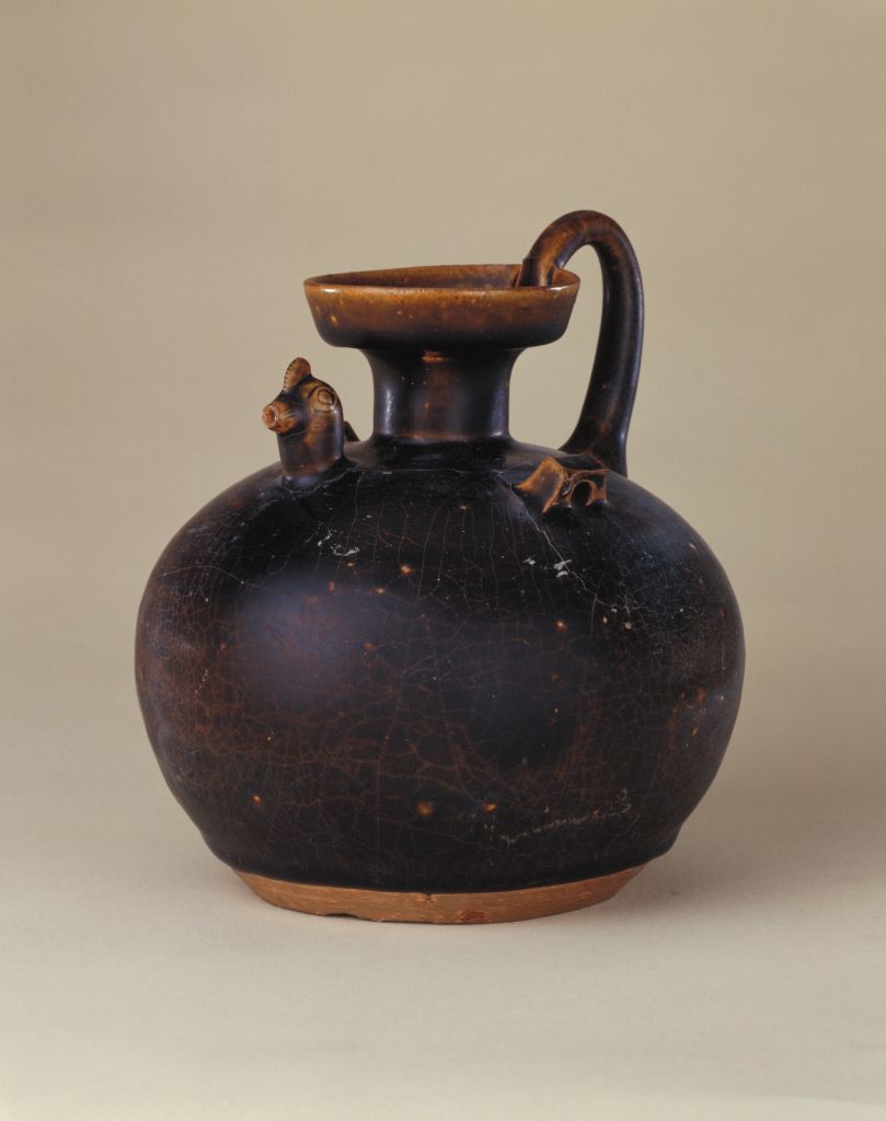 壺盤口,短頸,溜肩,鼓腹。肩部一側(cè)飾雞頭形流,流內(nèi)有孔與壺身相通,流嘴呈筒狀,雞冠高聳,雙目圓睜。與雞首相對(duì)的一側(cè)飾一彎形圓柄,上下分別與口沿、肩部相接,便于握持。肩部另外兩側(cè)各飾一橋形系,可穿繩提攜。壺施黑釉,釉層豐厚,釉面滋潤透澈,色黑如漆,勻凈無瑕。外壁施釉不到底,近足處露出褐色的胎體。