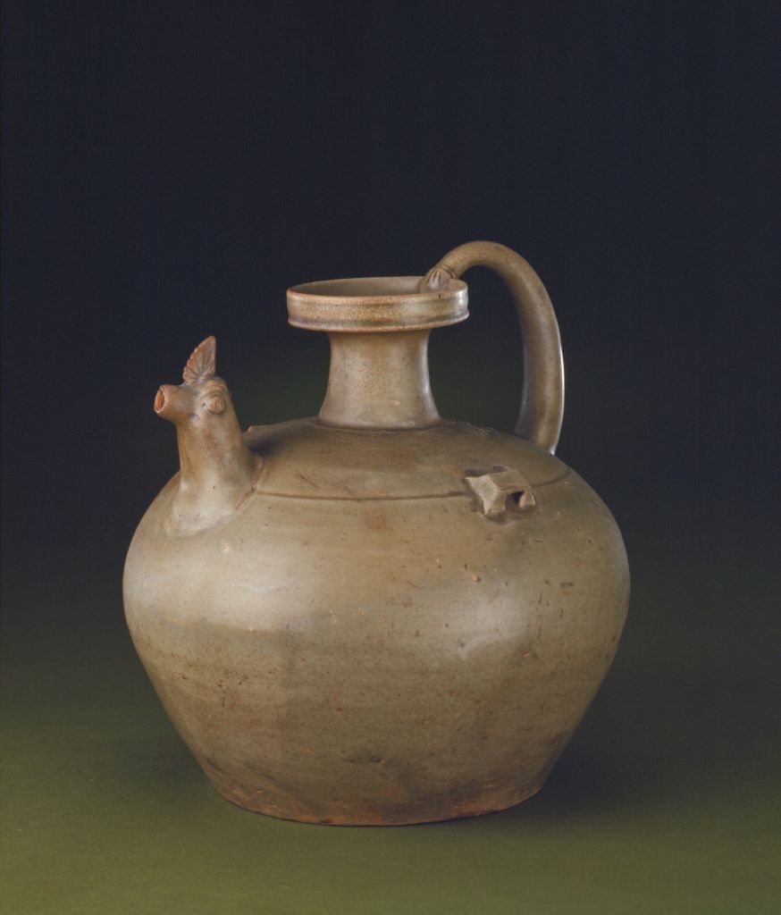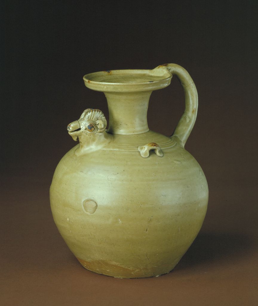 壺口淺盤式,細(xì)頸,球形腹,平底。肩部一側(cè)置羊頭形流,相對(duì)一側(cè)置曲柄,另外兩側(cè)各置一橫系。通體施青綠色釉,底部無釉。在壺口沿、羊頭及系上均涂點(diǎn)褐斑。肩部暗劃弦紋2道。