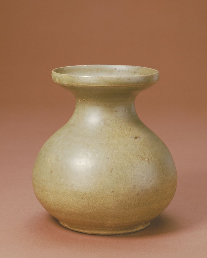 青釉唾壺,東晉,高14cm,口徑10cm,底徑8.5cm。