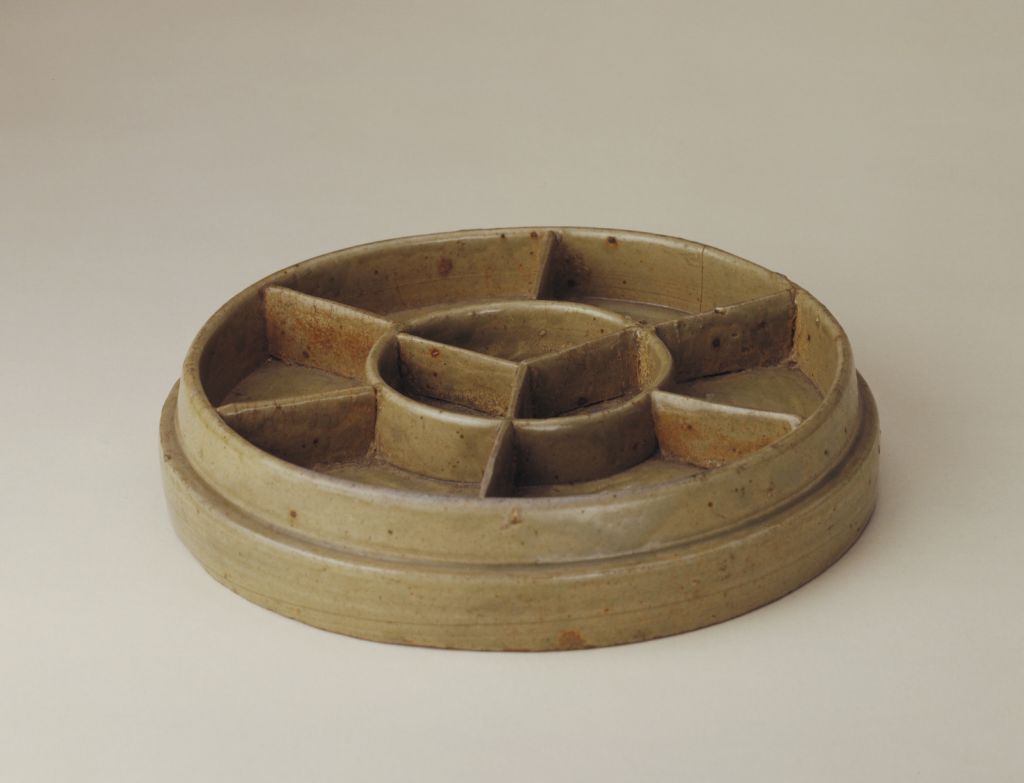 槅(gé 音格)呈圓形,直口,平底。底有紅色支燒痕。內(nèi)分九格,其中中心三等分,外周六等分。通體施青釉。