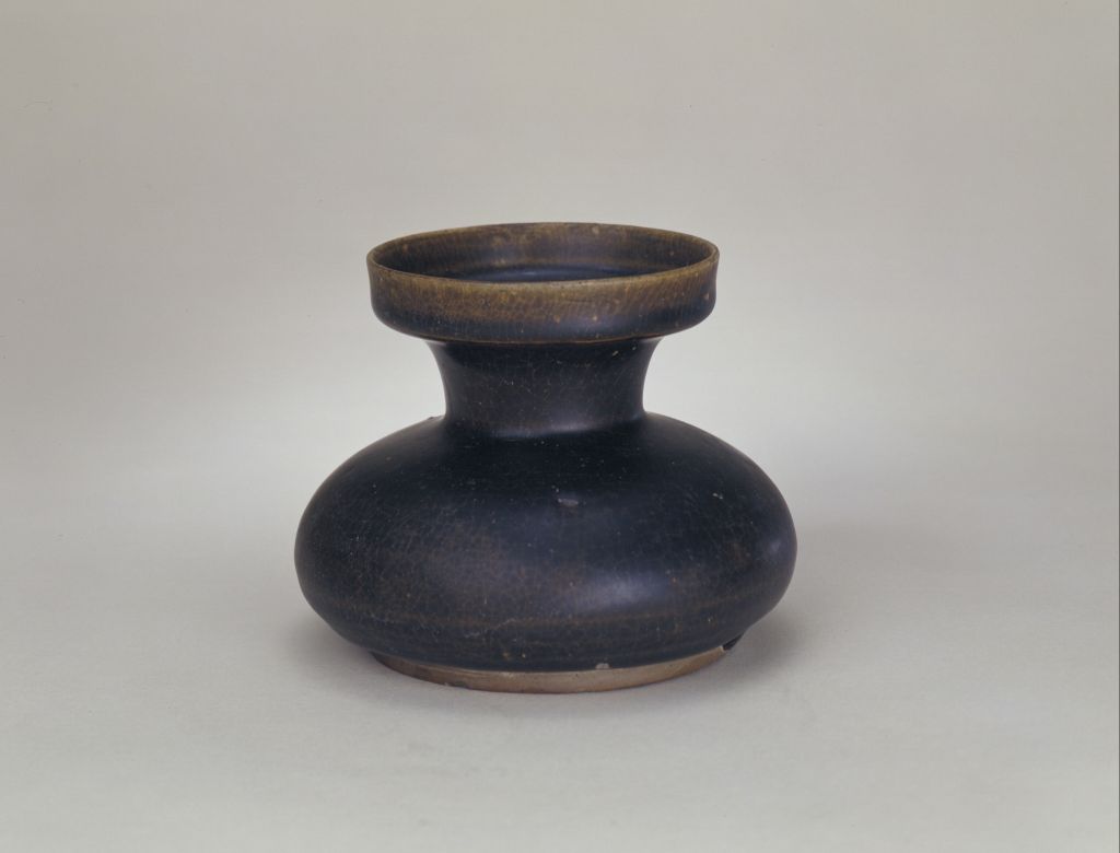 唾壺盤口,束頸,扁圓腹,平底略上凹。外壁施黑釉,釉不及底。因釉層在高溫熔融狀態(tài)下產(chǎn)生垂流,致使器物下部積釉處釉層較厚,堆積欲滴。釉面滋潤,開有片紋。