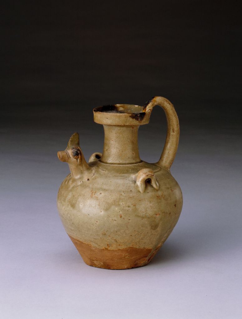 青釉褐彩雞首壺,東晉,口徑5.5cm,高15.4cm。