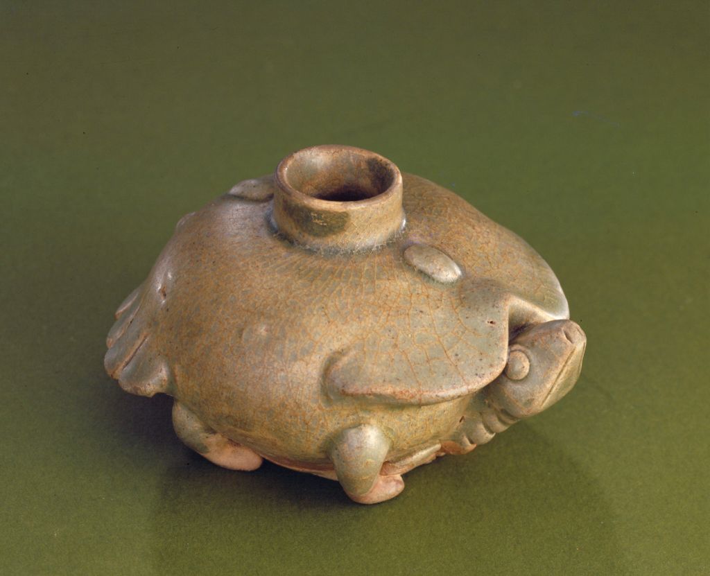 硯滴為烏龜形狀,龜首昂起,頸部刻劃螺旋紋。龜背前小后大,有圓形的小直口可以盛水,龜腹平坦,刻劃十瓣蓮花裝飾,通體施青釉不到底。