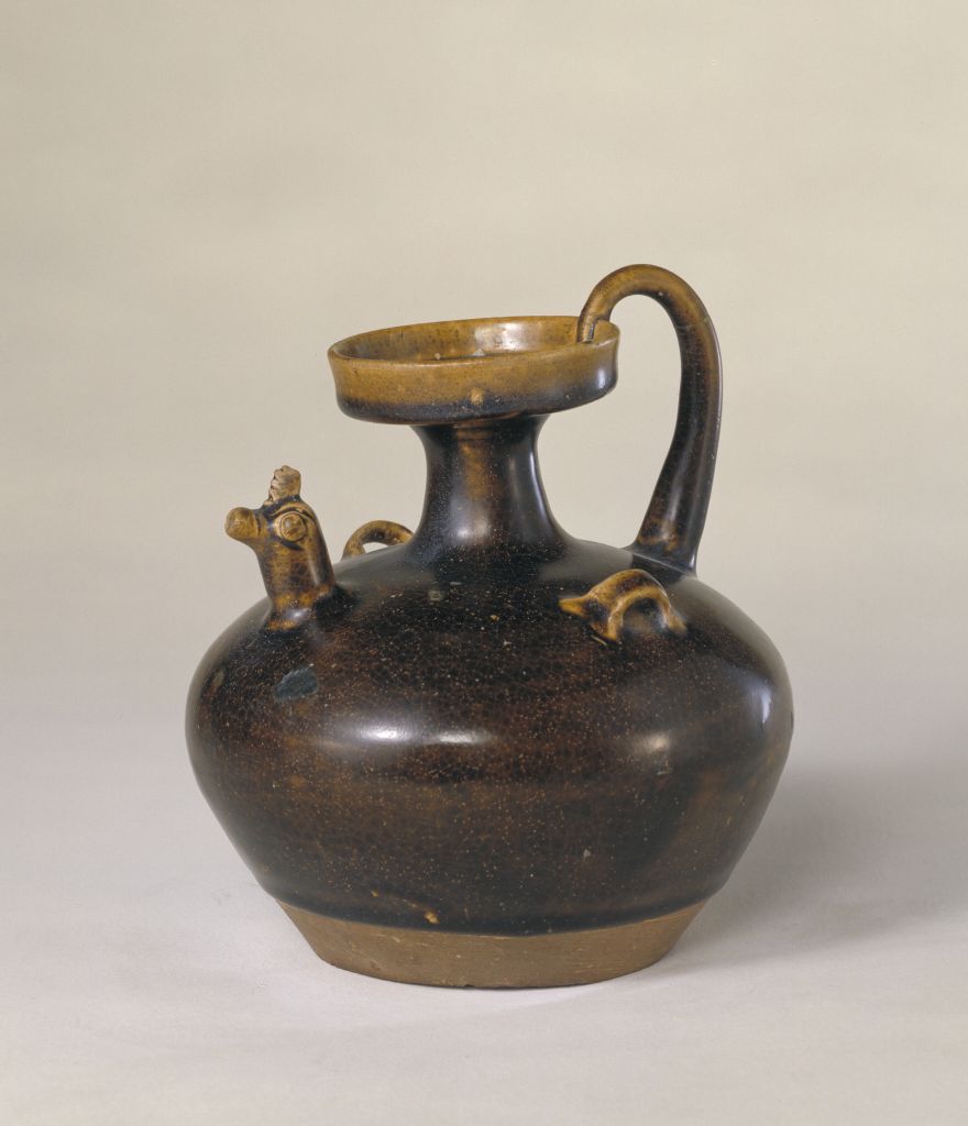 壺洗口,細(xì)頸,圓腹,平底。肩部一側(cè)雕塑一凸起的雞頭形流,相對(duì)一側(cè)飾安一曲柄,柄連于肩、口之間,另外兩側(cè)各飾一橋形系。壺身里外施釉,外壁釉不到底。釉色黑如漆。