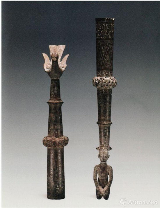 漢代時鳩杖是授予老者的“尊老杖”,而早于漢代的鳩杖是否有尊老的含義尚不能確定,但可以肯定的是它代表著一種身份地位的象征。一件紹興漓渚鎮(zhèn)出土的春秋時期青銅杖,因為杖首頂端立一只鳩鳥,被稱為“鳩杖”。它呈現(xiàn)重要的意義是:清晰地展示了兩千多年前古越人的形象。我們仔細看杖底端跪坐的人像,雙目圓睜,額前是整齊的頭發(fā),腦后籠成小小的椎髻,橫穿一笄,雙手扶膝,全身上下布滿各種形狀的紋飾,這就是一個典型的“斷發(fā)文身”的古越人。