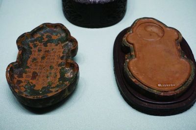 第三單元為“端石硯——質(zhì)堅(jiān)瑩潤(rùn) 益毫發(fā)墨”,主要展示清代康、雍、乾時(shí)期的御用硯以及賞賜用端石硯,其中有雍正皇帝賞賜長(zhǎng)春居士硯,即弘歷為皇子時(shí)被恩賜的端石硯。第四、第五單元?jiǎng)t分別展示了“歙石硯”與“澄泥硯”,體現(xiàn)出宮廷御用硯選材之精良和設(shè)計(jì)之精心,在造型、紋飾、雕刻等方面多有創(chuàng)新。澄泥硯用特種膠泥加工燒制而成,因燒過程及時(shí)間不同,可以是多種顏色,有的一硯多色,尤其講究雕刻技術(shù),有浮雕、半起胎、立體、過通等品種。澄泥硯由于使用經(jīng)過澄洗的細(xì)泥作為原料加工燒制而成,因此質(zhì)地細(xì)膩,具有貯水不涸、歷寒不冰、發(fā)墨而不損毫,滋潤(rùn)勝水可與石質(zhì)佳硯相媲美的特點(diǎn),因此前人多有贊譽(yù)。