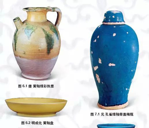 黃釉器也分為高溫和低溫兩種。低溫黃釉是一種以氧化鐵為呈色劑、鉛為助熔劑的低溫顏色釉,最早見于漢代陶器上,顯橙紅色澤,唐三彩中的黃釉即屬此類。早期的低溫鉛釉主要有棕黃色和綠色兩種,其中棕黃釉的著色劑是氧化鐵,綠釉為氧化銅。在歷經(jīng)唐、宋、遼、元、明、清各代的發(fā)展,低溫黃釉的種類和品質(zhì)都有了很大的進步。
