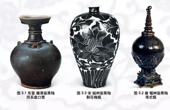 黑釉瓷器是以氧化鐵為主要呈色劑,并含有少量或微量的錳、鈷、銅、鉻等著色氧化物的陶瓷器,釉面呈赤褐色、暗褐色、黑褐色或黑色。黑釉分為石灰釉和石灰堿釉兩大類,東漢、東晉等早期黑釉都屬石灰釉,唐代以后基本上都改用石灰堿釉。就黑釉的品種而論,可以分為一般黑釉與花色黑釉兩大類。油滴、兔毫、玳瑁等,即屬花色黑釉。