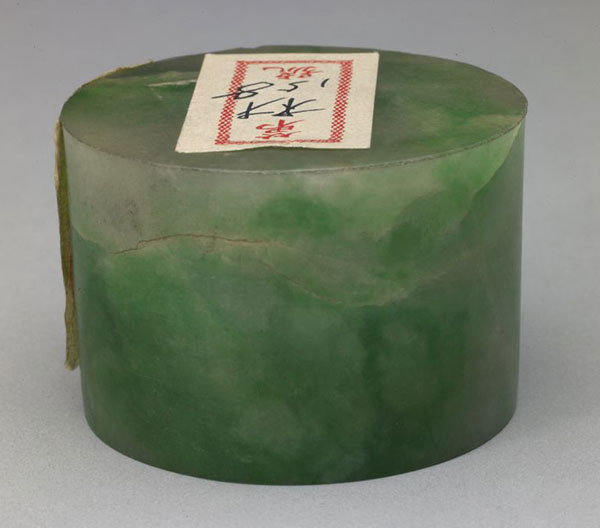 圓柱形,表面未刻紋飾,雖經(jīng)過打磨,但沒有做進一步的拋光,為加工翠鐲后留下的鐲芯。