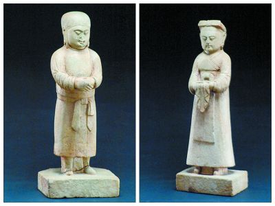 ▲契丹石俑(一對),巴林左旗白音勿拉蘇木白音罕山韓德讓家族墓地出土,內(nèi)蒙古文物考古研究所藏。