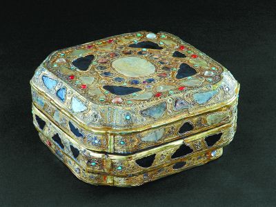 嵌寶石鎏金包銀漆盒,通遼市吐爾基山遼墓出土,內(nèi)蒙古文物考古研究所藏。