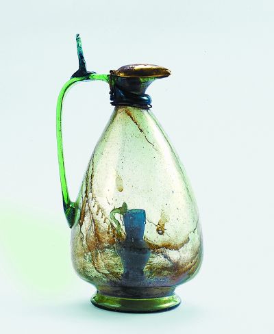 ▼波斯玻璃瓶,遼寧朝陽北塔天宮出土,朝陽北塔博物館藏。圈足,弧形腹,細頸, 口似鳥首,上安子母口式金蓋,柄上立短柱,似鳥尾,整體造型如一只昂首蹲坐之鳥。瓶內(nèi)立一長頸弧腹小瓶。此瓶呈淡綠色,極輕薄,晶瑩透明,而且造型奇特,是產(chǎn)于古代波斯地區(qū)的玻璃器珍品。