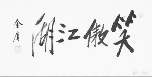 金庸先生是位書法愛好者,“字如其人”,他的人生軌跡一如其書法,頻繁游走于激昂和淡然、進取和隱逸之間,又貯滿了儒雅的文氣。在2017年嘉德四季第48期拍賣會上,金庸行書“笑傲江湖”以36800元人民幣價格拍出(見上圖),如此高價少不得“大俠”身份的助力,但以書法的美學(xué)語言來演繹武功,使書法的靜態(tài)畫面美和武功的動態(tài)行為美形成“通感”,確有非凡的藝術(shù)魅力。
