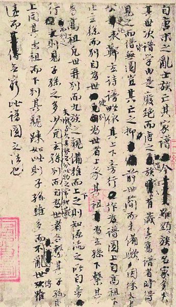自唐末之亂,士族亡其家譜。今雖顯族名家,多失其世次,譜學由是廢絕。而唐之遺族往往有藏其舊譜者,時得見之。而譜皆無圖,豈其亡之?抑前世簡而未備歟?因采太史公《史記》表,鄭玄《詩譜》,略依其上下、旁行,作為《譜圖》。上自高祖,下止玄孫,而別自為世。使別為世者,上承其祖為玄孫,下系其孫為高祖。凡世再別,而九族之親備。推而上下之,則知源流之所自;旁行而列之,則見子孫之多少。夫惟多與久,其勢必分,此物之常理也。故凡玄孫別而自為世者,各系其子孫,則上同其出祖,而下別其親疏。如此則子孫雖多而不亂,世傳雖遠而無窮。此譜圖之法也。