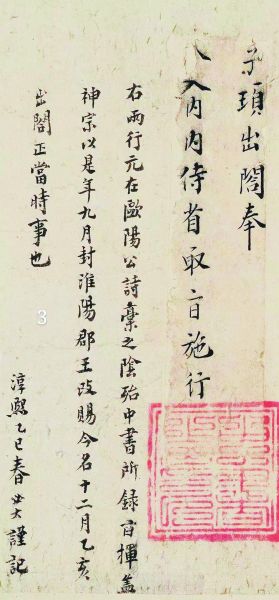 末了,想追加說一句,題為《歐陽修的廢紙里,竟然有封宋神宗為郡王的檔案》的文章,頗有些名不副實。這兩行字,據周必大文集所題,在宋代叫作“指揮”,是政事堂命令下級遵照辦理的指令。有時玩玩標題黨無可厚非,但從學術嚴謹?shù)慕嵌戎v,最好還是實事求是。